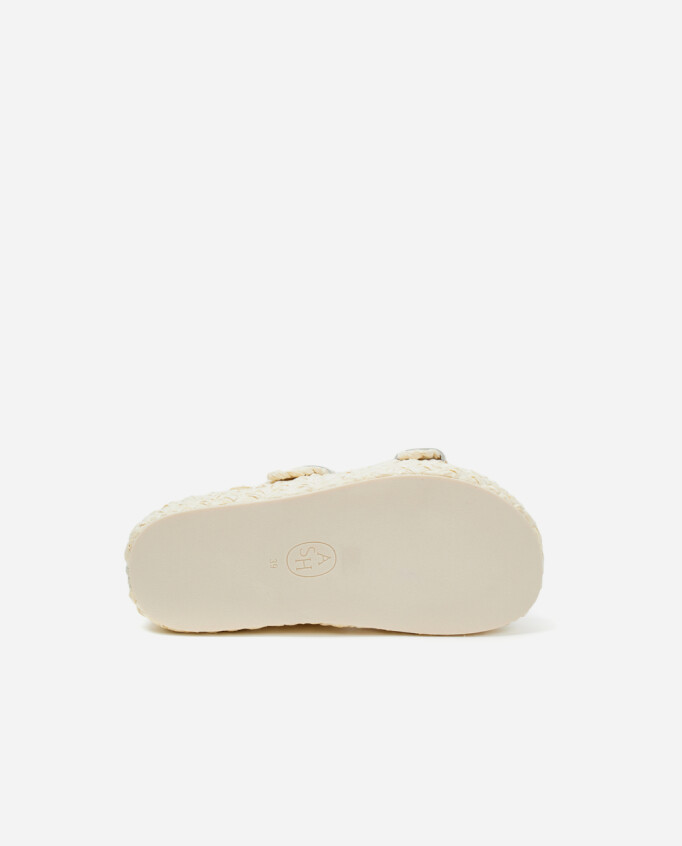 Сандалии ZIGGY на высокой подошве изготовлены из натуральной кожи с отделкой плетением из Рафии природного окрашивания. Модель украшена двумя ремешками с золотистыми пряжками.