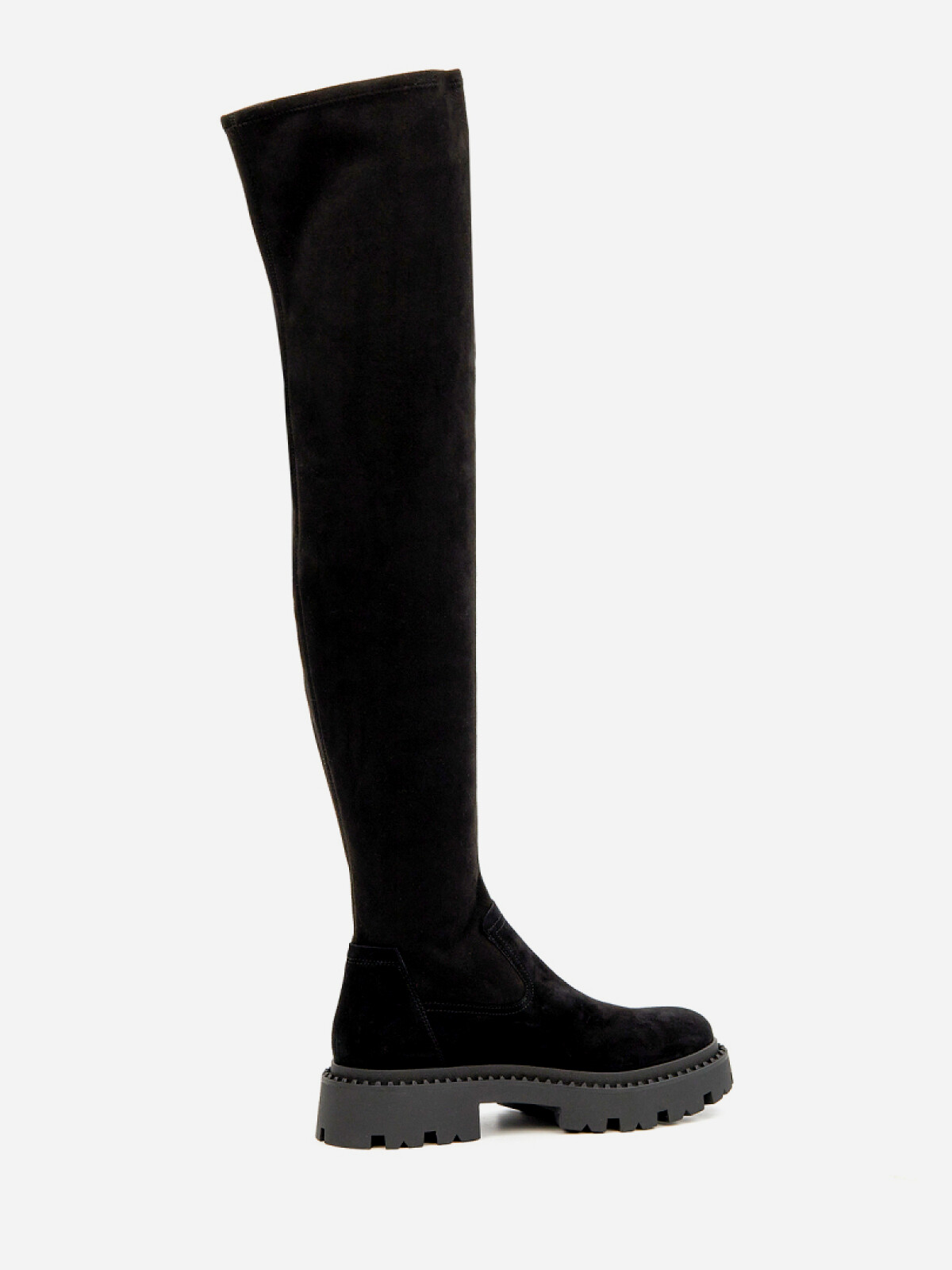 Ботфорты GILL на устойчивой широкой подошве с глубоким протектором выполнены из комбинации натуральной и стретч эко-замши для улучшенной посадки по ноге. Отсутствие каблука позволяет сочетать эти ботфорты с повседневными образами без потери комфорта.