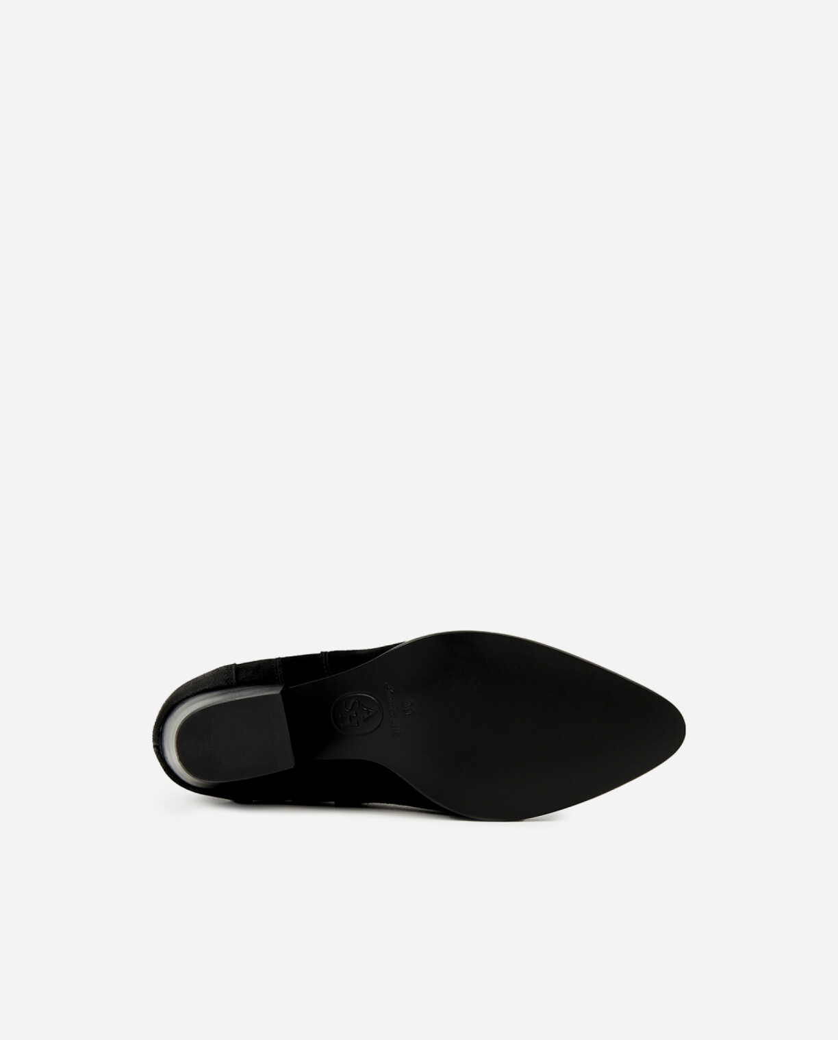 Казаки Hysteria выполненных из замши черного цвета с декоративными матовыми потертостями на передней и задней части. Верх украшен фигурными деталями и эластичной вставкой на боковой части. Пара идеально дополнит образы с фактурными материалами: денимом, кожей, шерстью.