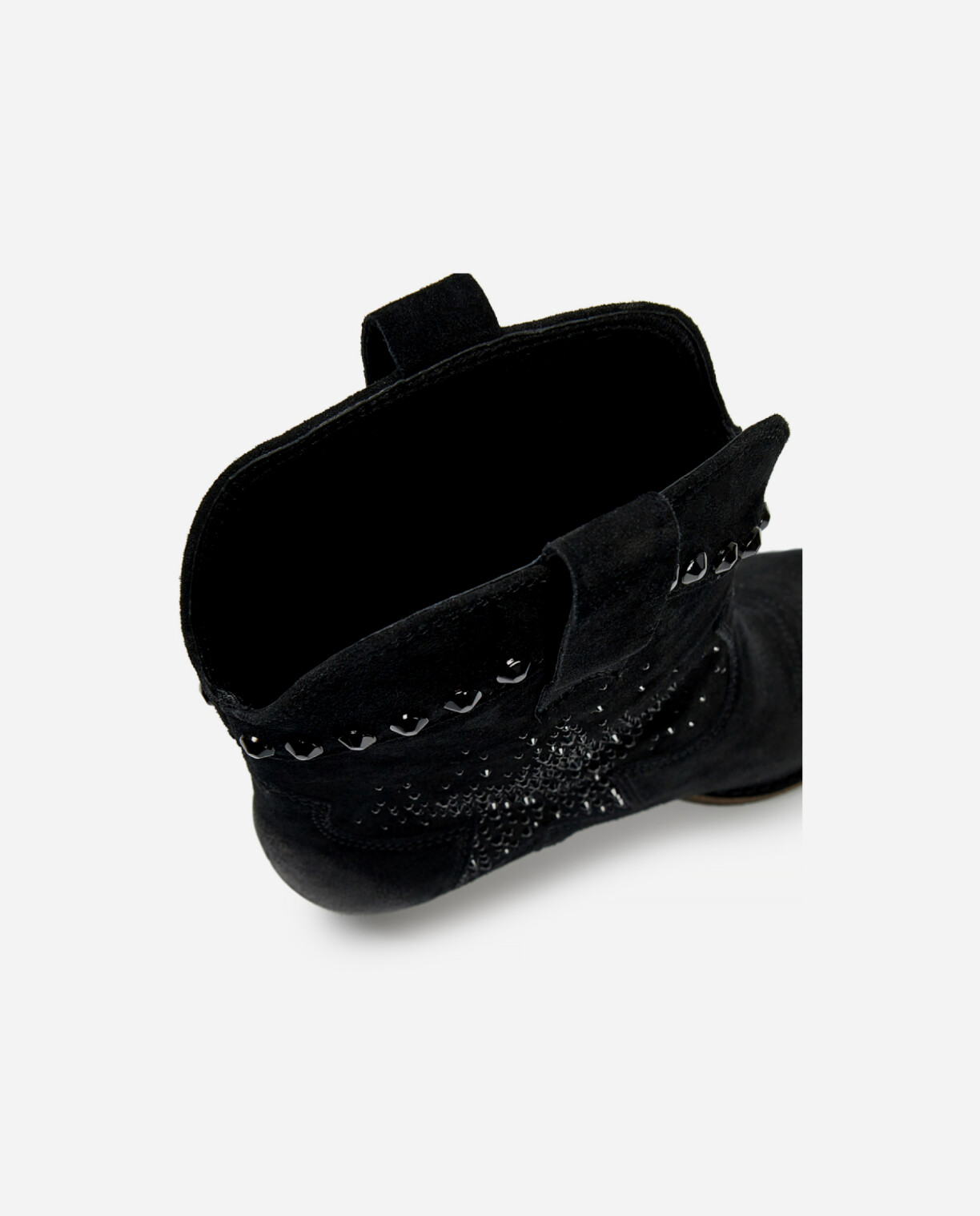 Казаки DALLAS изготовлены из мягкой черной замши. Классический силуэт дополнен деталями в традиционном западном стиле: фигурные накладки, декоративная вышивка и кубинский блочный каблук. Роскоши добавляет аппликация из черных страз в форме звезды, аккомпанирующая отделке голенища, и глянцевый эффект потертости на пятке и носке. Эта пара сделает праздничным даже самый простой образ.