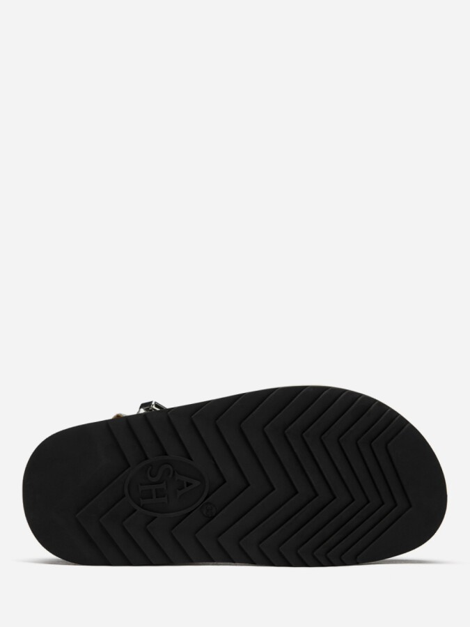 Черные сандалии UGO BIS на толстой подошве с эффектом многослойности украшены лентами с этническими мотивами, бисером и фактурными металлическими деталями. Кожаный ремешок на щиколотке регулируется застежкой-липучкой.
