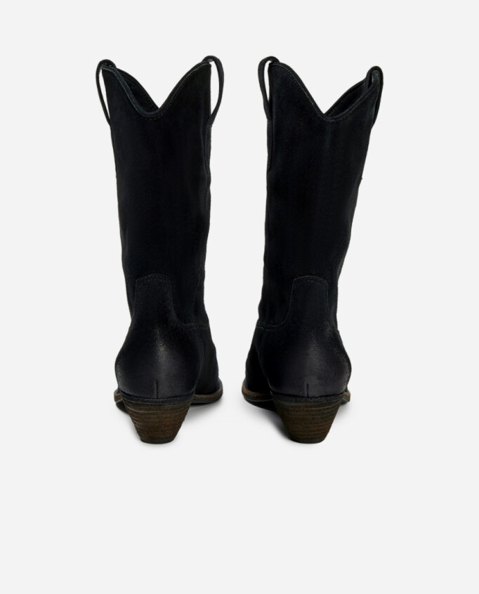 Высокие казаки DALTON выполнены из замши черного цвета. Длина до середины икры, скошенный блочный каблук и заостренный носок создают атмосферу запада. Пятка и носок дополнены глянцевым эффектом потертости. Сочетайте с юбками, скинни-джинсами или заправляйте в них брюки.