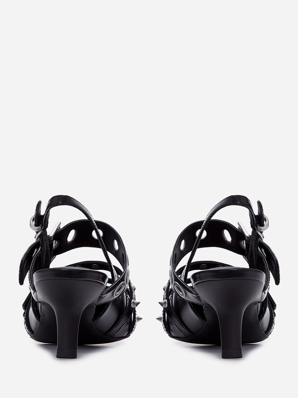 Туфли BABEL выполнены из натуральной гладкой кожи черного цвета. Пара украшена ремешками с множеством металлический элементов, что придает ей смелый характер, гармонично поддерживаемый заостренным мысом. Каждый ремешок регулируется с помощью пряжек, обеспечивая надежную и комфортную посадку.