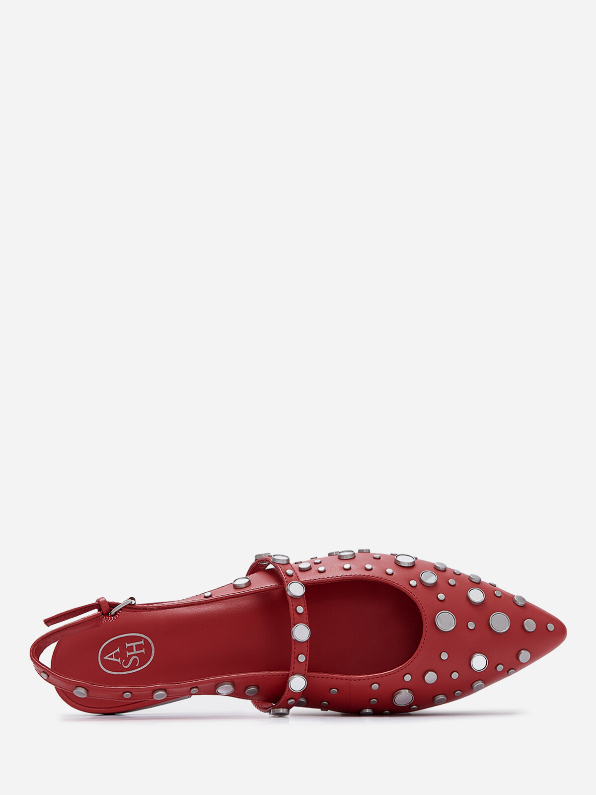 Слингбэки BRENDA выполнены из натуральной кожи алого цвета. Пара декорирована россыпью металлических заклепок разного размера, что придает ей акцентный вид и позволяет без труда превратить любой образ в нарядный. U-образный вырез, заостренный мыс и тонкие ремешки выгодно подчеркивают стопу.